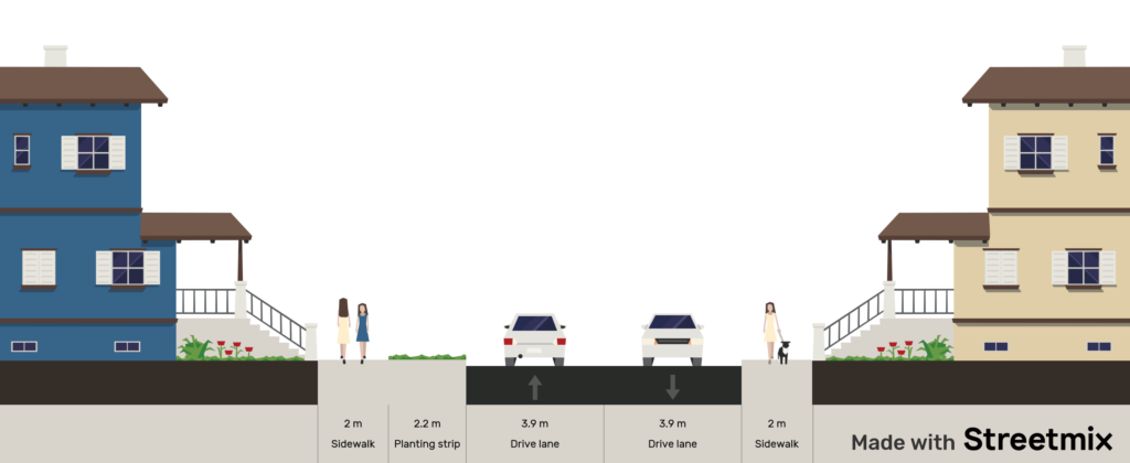 For the most part, this road (and many others) is perfectly wide enough to accommodate pedestrian footways, separated cycleways, small buffers, and bidirectional motor traffic – 13.6m of width is needed for minimum standards (2x 1.8m footways; 2x 1.5m cycleways; 2x 0.5m buffers; 2x 3m general traffic lanes). In fact, for much of the road there’d be space left over! Straightaway, safer cycling is enabled, pedestrians are kept further from motor traffic, and narrower general traffic lanes promote slower driving. Couple this with any additional traffic calming measures that may be deemed suitable to reinforce a new 20mph speed limit and the road becomes a much safer place, where even if a collision does occur for whatever reason, the lower speeds mean the results are likely to be less serious.