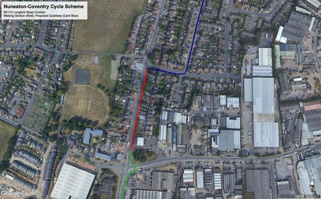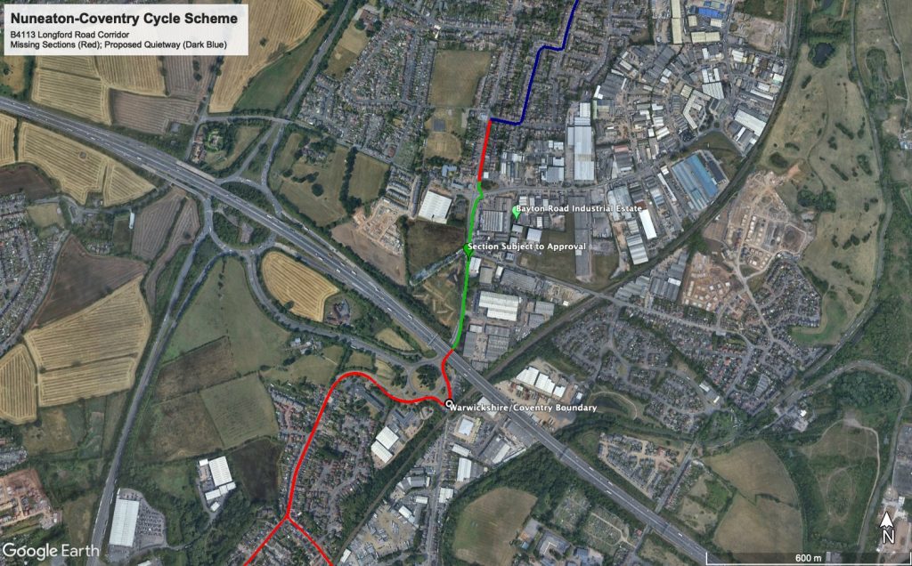 The long-awaited Nuneaton to Coventry “super cycleway” may take a small step forward later this week with a tiny part of the route being put to the Portfolio Holder for Transport for approval. This features as part of a broader programme of road improvements and covers the south-most section through Exhall – only about 0.55km (0.35mi) and with serious compromises in quality.